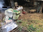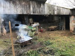 kleines Feuer in einer alten Schubkarre gemacht wurde in dem Tannengrün verbrand wurde.