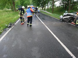 Am 06.06.19 um 16.41 Uhr wurde wir zu einem Verkehrsunfall alarmiert bei dem es zu einem Frontalzusammenstoß zwischen zwei PKW kam. Die Fahrzeugführer konnten sich selbstständig aus den Fahrzeugen befreien und wurden vom Rettungsdienst versorgt. Durch die Feuerwehr wurden die bei dem Unfall freigesetzten Betriebsmittel aufgenommen, die Straße gereinigt und die Fahrzeugbatterien abgeklemmt.