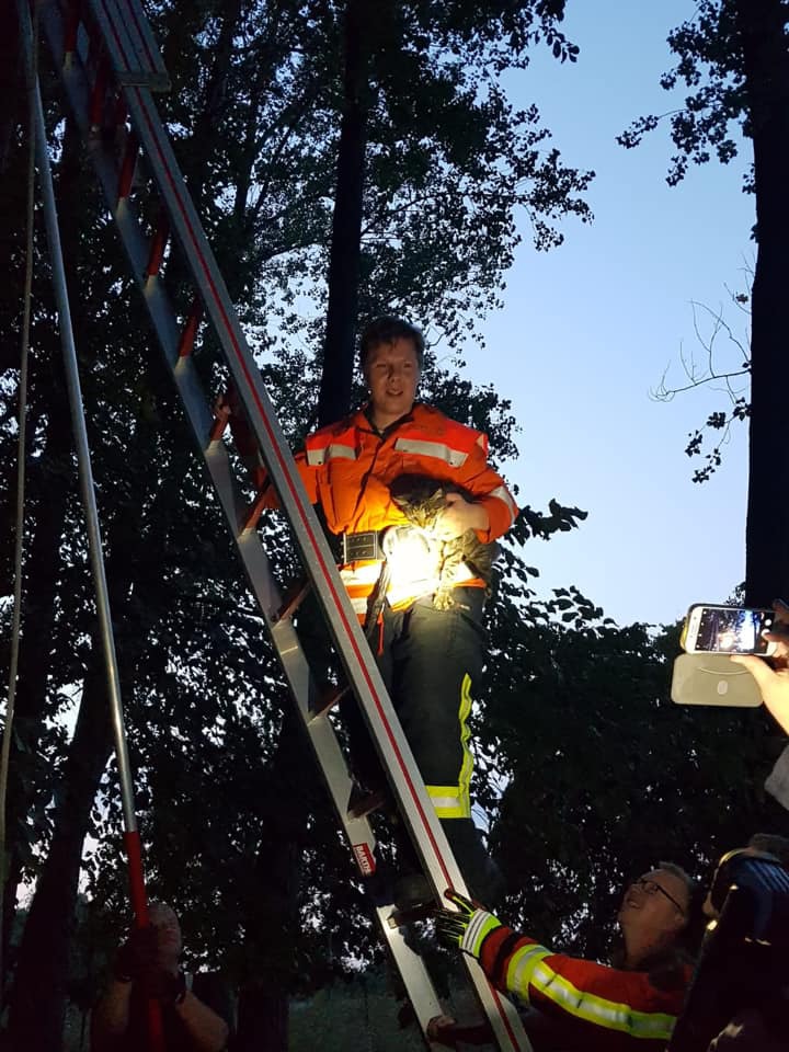 Durch Vornahme der 3 tlg. Schiebleiter konnte die Katze aus ca. 10m Höhe gerettet werden.